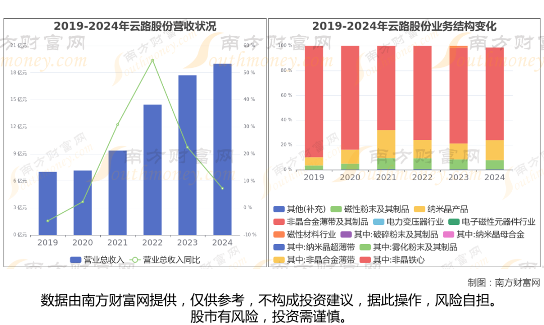 云路股份财务数据显示(如上图): 2024年实现营业总收入 19亿,同比增长7.24%。近五年复合增长率(CAGR)为27.67%。