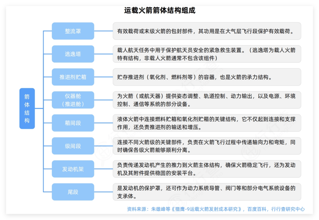 从价值占比看,推进系统(发动机)占比约 50%,是产业链核心利润区;贮箱/整流罩等箭体结构占比约 15 – 25%,航电系统占比约 8 - 15%。