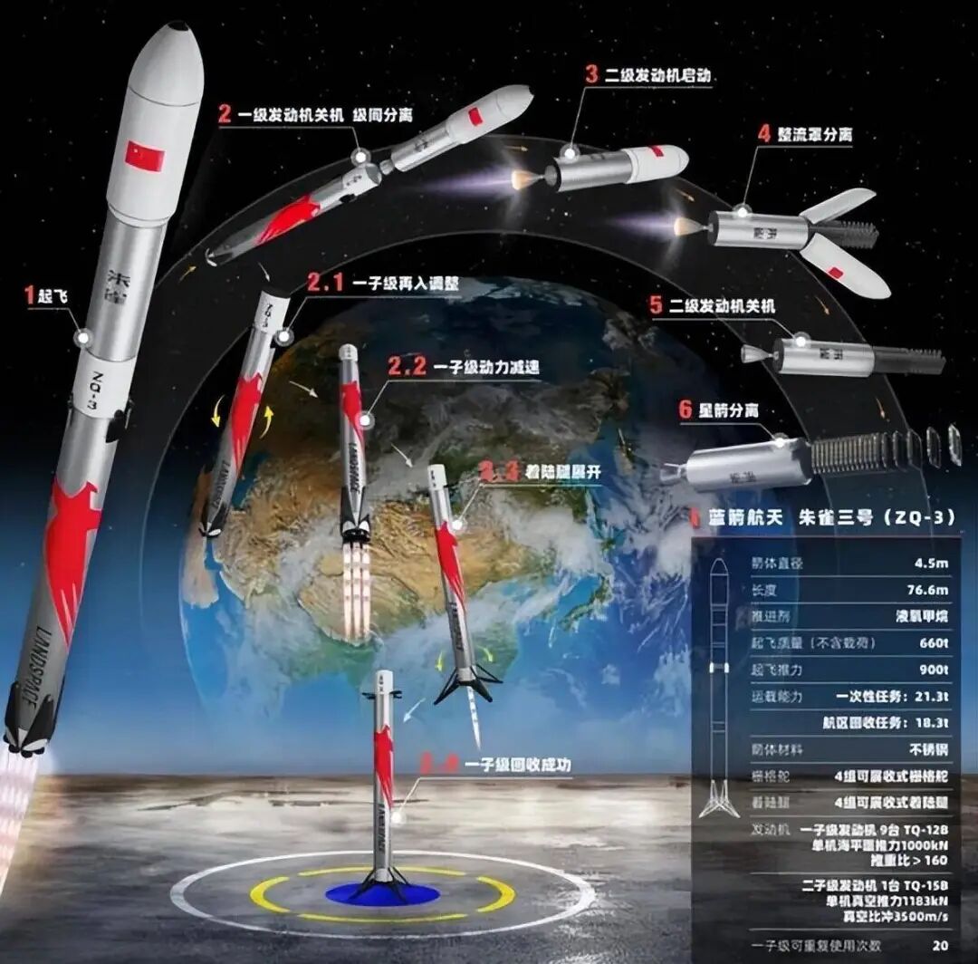 蓝箭航天朱雀三号火箭介绍及可回收示意图: