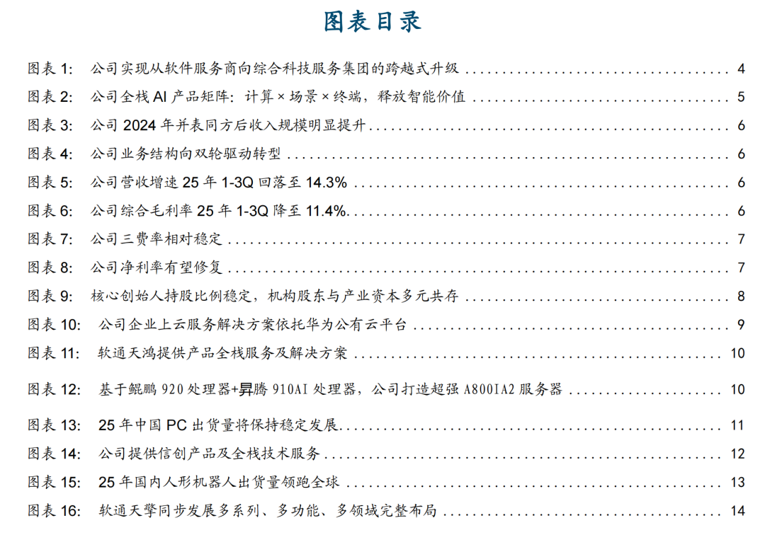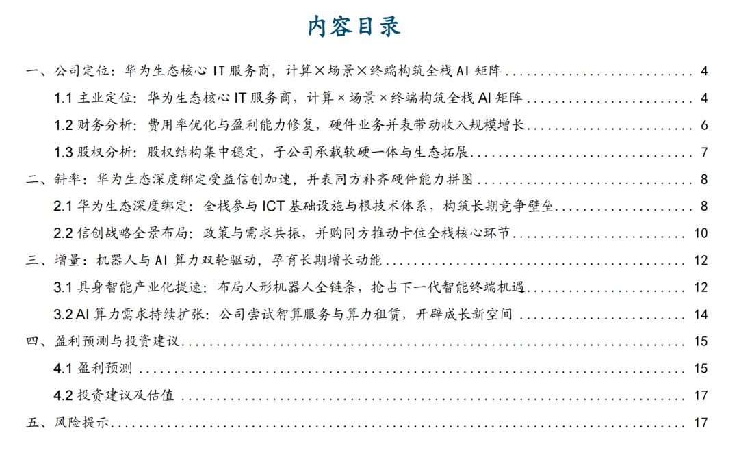 公司定位:华为生态核心 IT 服务商,“软硬一体”战略构筑全栈增长矩阵。公司为国内领先的全栈智能化产品与服务提供商,蝉联中国 IT服务市场与国内IT咨询厂商首位,华为云官网披露公司为2022年华为云首家CTSP服务伙伴及首批盘古大模型合作伙伴,公司亦深度参与华为云、昇腾、鲲鹏、鸿蒙、欧拉、高斯等华为全体系生态共建。24年完成同方计算机并表,快速补齐信创PC、AI终端与算力硬件能力, 26年1月30日,公司完成33.48亿元向特定对象发行,发行价40.71元/股,募资主要用于京津冀软通信创智造基地、AIPC智能制造基地、怀来智算中心(一期)及计算机生产车间智能升级技改项目。25年前三季度营收同增14.3%,归母净利润同增30.2%。