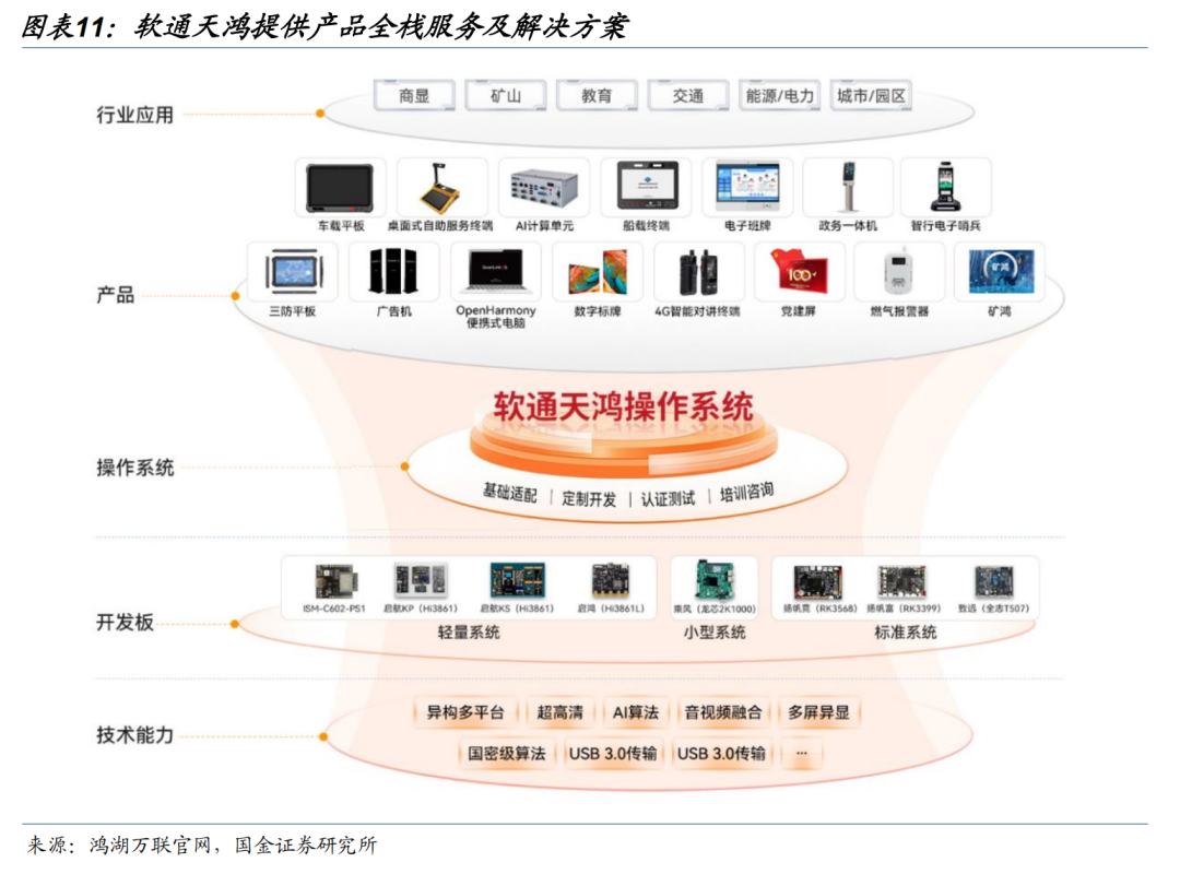 根技术体系共建,公司深度参与鸿蒙、欧拉等底层生态建设。2020年,华为鸿蒙操作系统的源代码捐赠给中国开放原子开源基金会(OpenAtomFoundation),开源鸿蒙(OpenHarmony)目标是面向全场景、全连接、全智能时代,搭建智能终端设备操作系统的框架和平台,促进万物互联网繁荣发展。公司与华为合作的生态领域中,开源鸿蒙生态地位领先,子公司鸿湖万联成为鸿蒙产业化核心载体,全面承接软通动力OpenHarmony战略,深耕OpenHarmony技术,提供OpenHarmony产品全栈服务及解决方案。在此技术基础上,公司自研天鸿操作系统,构建了以“天鸿操作系统SwanLinkOS 鸿鹄云管理平台”为核心的全产业链生态,完成近10款国产芯片适配;矿鸿领域实现20 场景、60 认证、近100款设备适配。