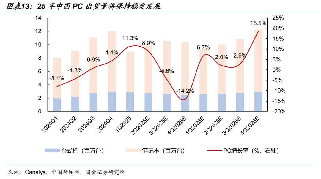 在数字中国与自主可控战略持续推进背景下,信创产业已由“政策驱动”迈入“需求与产业共振”阶段,成为国内ICT行业最重要的增长主线之一。从市场空间来看,信创产业正迎来快速增长阶段,产业链逐步完善,自2018年信创市场规模持续增长,2027年中国信创市场有望达到37011亿元。具体来看,信创产业链可分为基础硬件、基础软件、应用软件等核心环节。其中,基础软硬件作为“卡脖子”环节,是政策与市场投入的重点方向。Canalys在6月17日发布的最新数据显示,2025年第一季度,中国大陆PC市场(不含平板)出货量达890万台,同比增长12%。