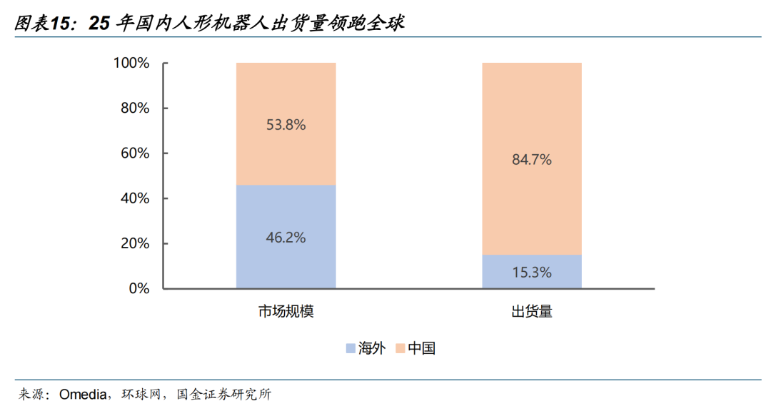 在产品落地层面,我国已经形成全球最完整的具身机器人量产链条。2025年国内人形机器人市场规模占据全球份额53.8%,整机出货量占全球比重达84.7%,成为全球最大的生产与应用市场。以智元、宇树、优必选等为代表的国内企业,分别以5168/4200/1000的年度出货量,占据全球出货量前三席位,先后实现多款人形与四足机器人量产下线,展示出中国人形机器人强大的爆发力。核心零部件国产化率持续提升,叠加国产大模型在具身决策、环境理解、任务规划上的深度赋能,我国具身机器人在成本控制、场景适配、规模化落地能力上已具备全球竞争力。