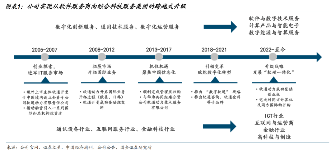 国内领先的全栈智能化产品与服务提供商。目前公司已形成软件与数字技术服务、计算产品与智能电子、数字能源和智算服务三大核心业务板块,构建了“软硬一体、全栈智能”的业务生态。公司前身为软通动力信息技术(集团)有限公司,2020年9月完成整体变更设立为股份有限公司,2022年3月15日在深圳证券交易所挂牌交易。早期以软件与信息技术服务为基础,深耕ICT、互联网、金融等领域,随着数字经济与人工智能产业的快速发展,逐步推进“智能化、自主化、绿色化、国际化”战略,向“技术 产品 服务 生态”的综合布局演进,形成覆盖数字技术、智能硬件、能源服务、算力支撑的全产业链服务能力。