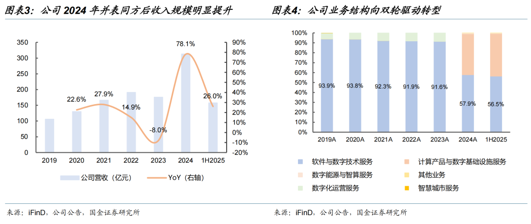 公司业务结构逐步转型。从业务结构来看,2019-2023年软件与数字技术服务营收占比长期稳定在90%以上,覆盖咨询与解决方案、数字技术服务及通用技术服务,是公司营收与利润的核心来源,其余数字化运营、智慧城市等业务占比不足10%;2024年公司正式完成同方计算机战略并购,业务口径重构,将原软件服务边界拆分,独立出计算产品与数字基础设施服务,囊括计算产品(PC终端业务等)及智能电子业务,公司结构由单一核心向双轮驱动转型,成长边界进一步拓宽。