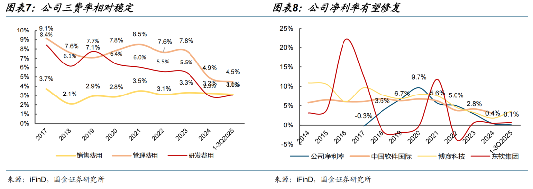 行业周期波动下,公司盈利能力先抑后扬,修复趋势明确。2017年受行业调整影响净利率短暂转负至-0.3%,后续逐步修复;行业景气阶段,公司净利率表现亮眼,2020年达到9.7%的阶段性高位;2024年随行业整体下行,净利率回落至0.4%,1-3Q2025进一步收窄至0.1%,但整体保持在健康区间。随着数字化转型需求复苏、高毛利业务占比提升及公司持续降本增效,预计净利率将随订单交付与产能利用率改善逐步回升,业绩弹性有望持续释放。