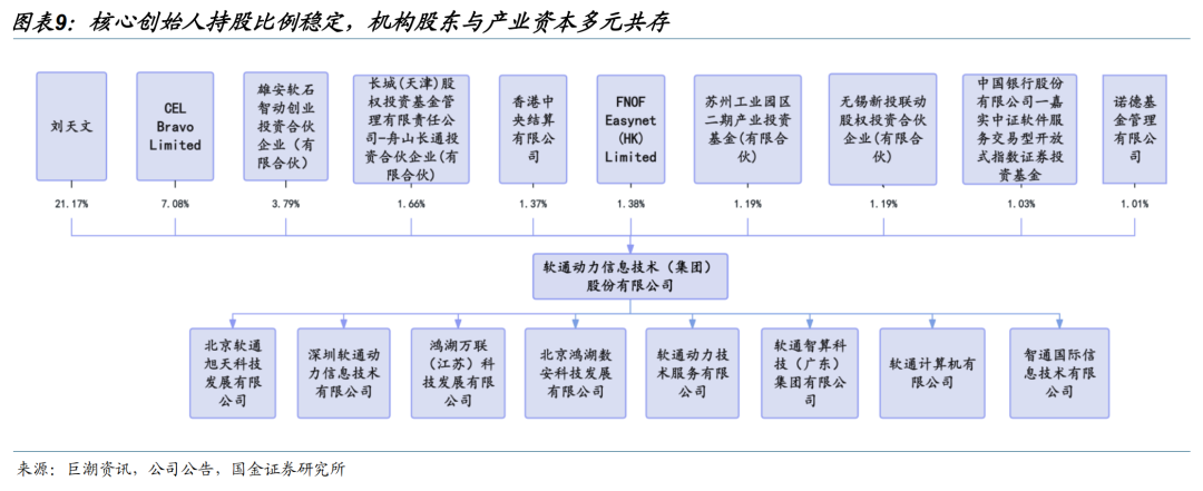 1.3股权分析:股权结构集中稳定,子公司承载软硬一体与生态拓展公司股权结构仍由创始人及其一致行动人主导,机构股东与产业资本多元共存。根据公司2026年向特定对象发行股票上市公告书及权益变动公告,刘天文在减持计划实施完毕后直接持有2.19亿股;本次定增完成后公司总股本增至10.35亿股,刘天文直接持股比例由发行前约23.00%被动稀释至21.17%,仍为公司控股股东及核心决策人,其他机构投资者及公募基金合计持股比例大部分均处于在5%以下,股权结构稳定且分散。同时公司通过控股子公司多点布局,持续拓展数字化服务与新兴技术领域。