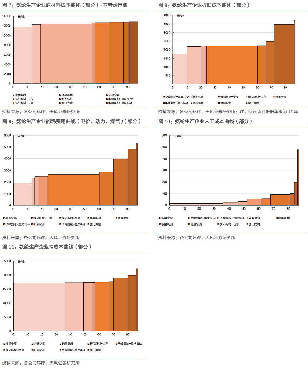 折旧方面,氨纶企业中上市公司的折旧费用相较于行业其他公司水平较低,体现公司较强的运营管理能力,不同企业的折旧成本差距可以达约2000元/吨。此外,据华峰化学公告,公司在重庆建设 25 万吨/年差别化氨纶项目,项目总投资预计38.0亿元,折合单吨折旧额仅为1520元/吨,与行业较高者差距可达2300元/吨。