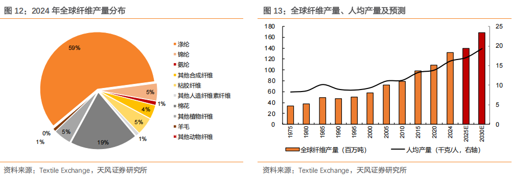 全球纤维产量规模持续扩张,人均纤维产量同步增长。据Textile Exchange统计,1975年全球纤维产量为0.34亿吨,2000年增长至0.58亿吨,到2024年产量规模进一步扩张至1.32亿吨;其中,2000-2024年CAGR为3.49%。同期,全球人均纤维产量由1975年的8.3千克/人增长至2024年的16.2千克/人。同样,据Textile Exchange预测,到2025、2030年,全球纤维产量有望达到1.40、1.69亿吨,2024-2030年CAGR为4.2%;对应人均纤维产量约17.1千克/人、19.4千克/人。