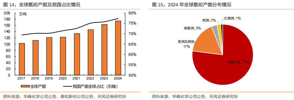 全球氨纶产能由2000年的20.3万吨增长至2024年175万吨,CAGR为9.4%,其中超90%的产能集中在亚洲地区(占比94%),南美洲/欧洲/北美洲地区产能占比各3%/2%/1%。