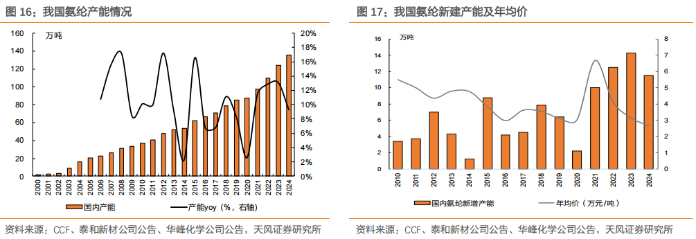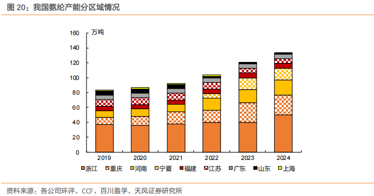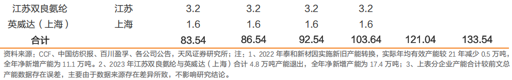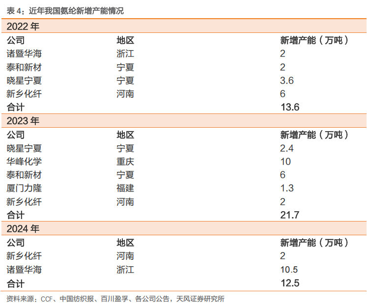 第四轮产能集中扩张在2020-2024年,产能由87.2万吨扩张至约135万吨,新增产能规模达到历史高位。2020年在口罩及防护用氨纶、居家瑜伽服等下游需求快速增长,以及原材料价格上涨带动氨纶行业景气显著提升,企业盈利驱动下再次迎来大规模产能扩张。