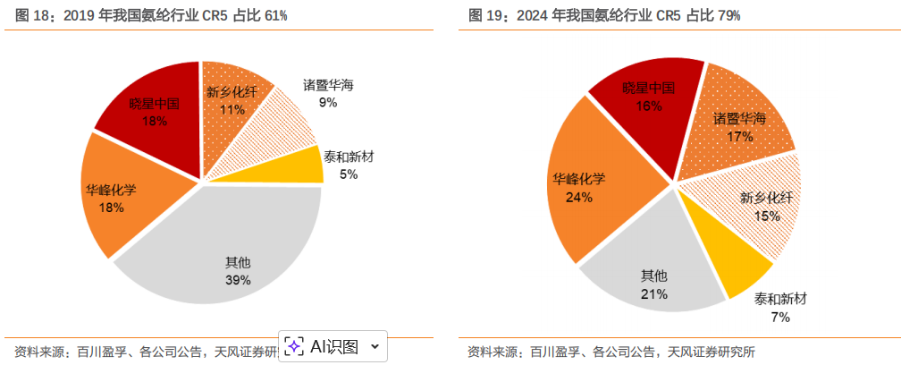 近年来,行业新增产能集中在头部企业,龙头企业的产能、技术和规模优势不断提升,带来其成本优势更强。而中小企业的生存环境呈现恶化,行业产能加速向头部企业集中。截至2024年,我国氨纶行业前五大生产企业合计产能约为107万吨,占全国总产能的79%,较2019年的CR5=61%提升18个百分点,行业集中度提升,头部效应明显。