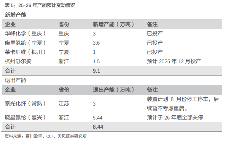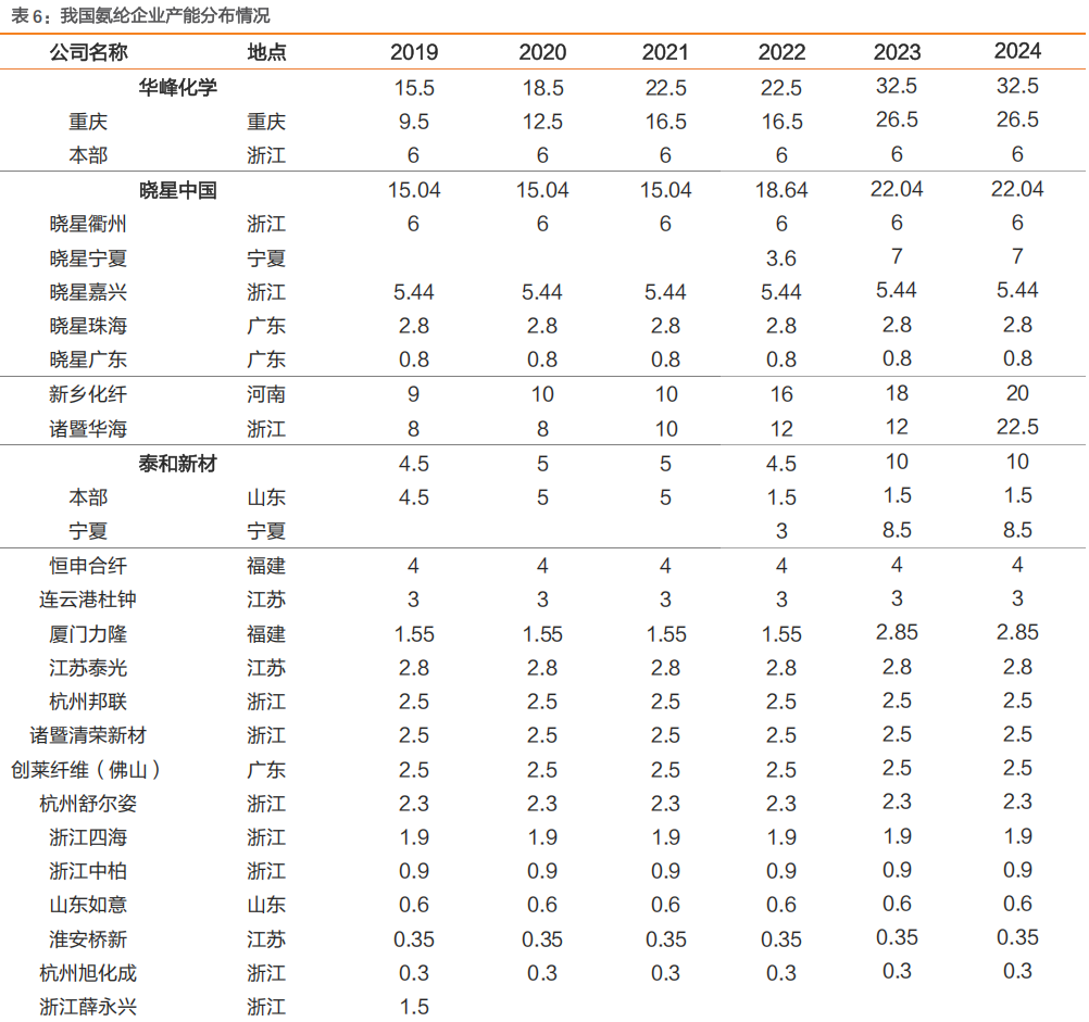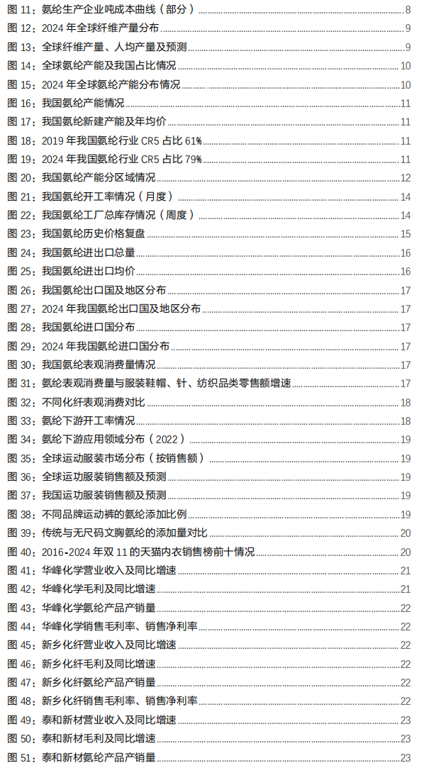 我国氨纶企业综合考虑投产效益等因素,部分新增产能延期或减投;且由于行业近年来内卷严重,氨纶产品售价及利润受到影响,行业中后期淘汰产能或持续增加。具体地,华峰化学于2024年底公告,公司“年产30万吨差别化氨纶扩建项目”将产能调整为25万吨,全部产能原达产日期由2025年的2月延期至2026年12月。据不完全统计,25-26年国内预计有约8.44万吨产能面临淘汰及出清。