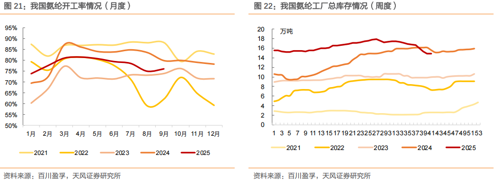 2025年以来,氨纶开工负荷维持近5年中枢水平高,库存水平存一定压力,但9月小幅去库。截至2025年9月,氨纶行业开工率为76.08%,较年初提升2.24pcts;工厂库存水平为14.9万吨(25/10/17),较年内峰值已去库约3.0万吨。