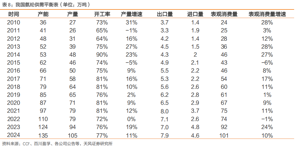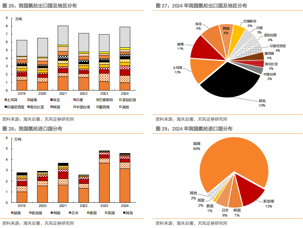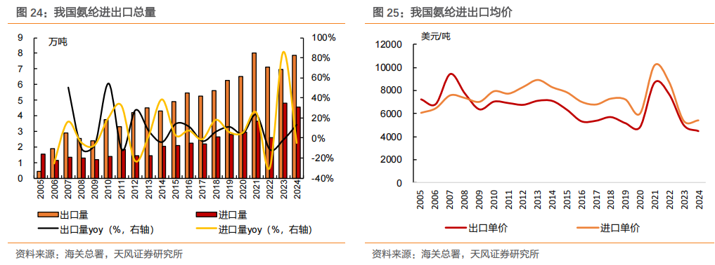 我国是氨纶的净出口国,出口规模持续增长。我国自2006年成为氨纶净出口国,是全球重要的氨纶出口国之一。据海关税则号54024410统计,2006年我国氨纶出口量为1.91万吨,到2024年增加至7.88万吨,CAGR为8.2%,24年出口量占当年产量的7.5%。同期,我国氨纶进口量由1.14万吨增长至4.56万吨,CAGR为8.0%,24年进口量占当年表观消费量的4.5%。