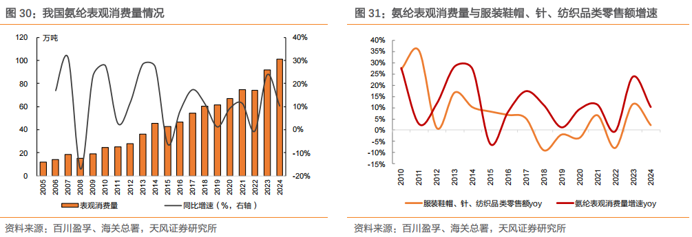我国氨纶消费规模持续增长,需求增速保持强劲。伴随人们对时尚潮流和舒适性的追求以及消费观点的升级,我国氨纶需求量持续增加。2005年,我国氨纶表观消费量为12.1万吨,到2024年消费规模增长至101.2万吨,2005-2024年需求量CAGR达到11.8%,且表需增速高于下游服装鞋帽、针、纺织品类零售额增速。