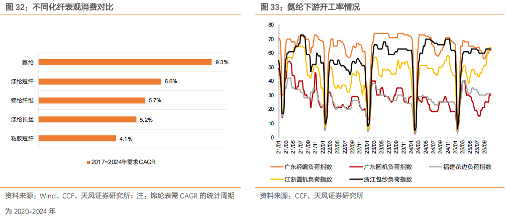 与其他化纤横向对比来看,2017-2024年氨纶表观消费量的CAGR位居首位达到9.3%,需求增速表现强劲;而同期,涤纶短纤/锦纶纤维/涤纶长丝/粘胶短纤表观消费量的CAGR分别为6.6%/5.7%/5.2%/4.1%。