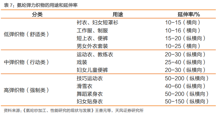 在使用形式方面,氨纶可以与其他纤维纶一起制成包覆纱、包芯纱等纱线,后经过经编、纬编、机织等设备进行加工织造,制成纺织品。氨纶下游广泛应用在纺织服装领域,其被称为“面料味精”,在织物中添加3%比例的氨纶足以改善织物弹性和舒适性,可以大幅提高织物性能。