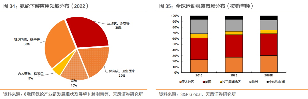 氨纶已从最早应用于女性内衣,扩展至鞋帽服装等所有领域;其中以运动服饰、内衣服饰为代表的高氨纶含量的服装市场持续增长,带动氨纶需求增量。从下游应用分布上看,内衣、袜子和运动服装等针织产品为主要下游应用领域,需求占比约60%(2022年),其他需求领域包括休闲衣、卫生医疗(20%)、家纺用品(15%)以及内衣蕾丝等领域(5%)。