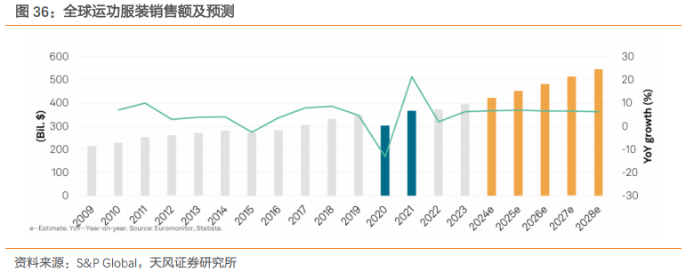 亚太地区运动服装市场有望成为全球增长最快的地区。据S&P Global的数据,2023年全球运动服装市场规模约为3950亿美元,其中占比最大的为美国地区,比例为40%;第二大消费地区为亚太地区,全球占比由2015年的23%提升至27%。据S&P Global预测,到2028年亚太地区运动服装的市场份额有望进一步提升至30%。
