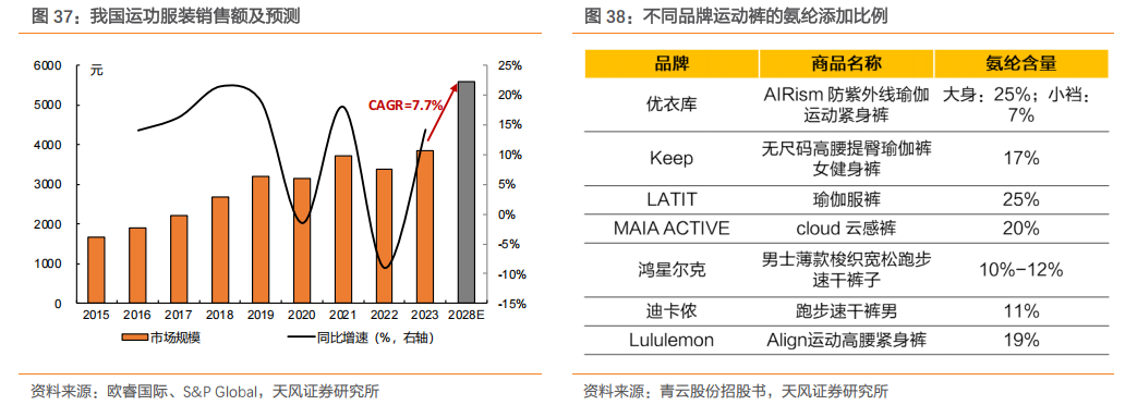 我国运动服饰市场规模增加带动对氨纶的需求增量。运动服饰的面料主成分通常为涤纶、锦纶和棉,部分运动服饰的面料仅有主成分。近年来,对于追求高舒适性和良好弹性的运动服饰基本都会添加氨纶。以运动裤为例,以舒适为主打的瑜伽裤、紧身裤的氨纶添加量平均在20%以上;以速干为卖点的跑步裤氨纶含量约在10%。