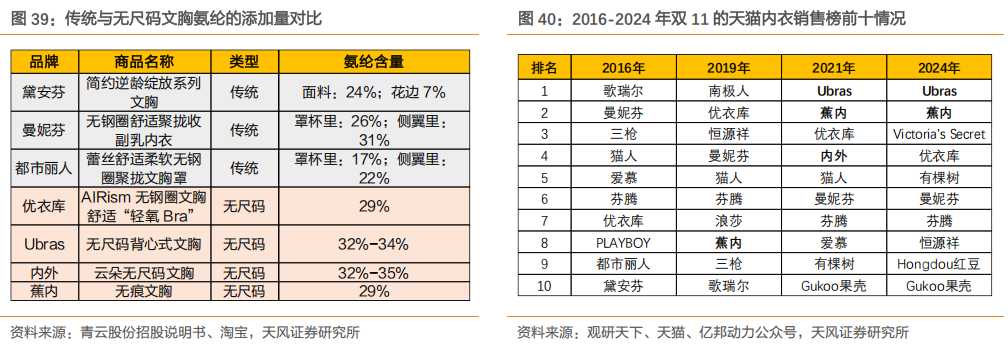 无尺码文胸氨纶添加量高于传统文胸,近年来需求明显提升,带动氨纶需求量。无尺码文胸通常没有钢圈,采用简单的尺码体系或者均码,而不再区分罩杯和胸围,因此对面料的弹性较传统文胸有更高的要求。随着“新舒适主义”、“悦己风”等潮流的盛行,消费者提高了对内衣舒适度的重视,以Ubras、NEIWAI(内外)等品牌为代表的无尺码文胸受到青睐,进而提升了品牌竞争力。例如,对比2016-2024年“双十一天猫内衣销售榜”前十的品牌可以看出,Ubras、蕉内等新锐内衣品牌的销售额排名靠前。