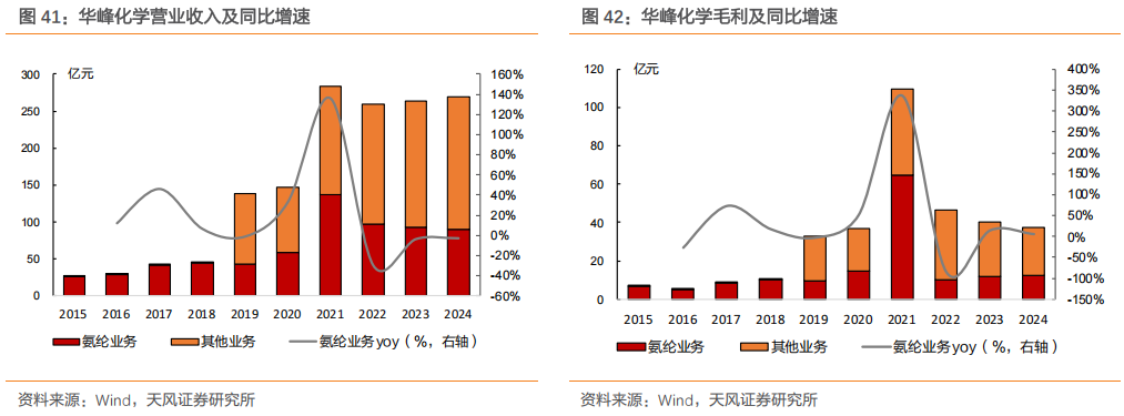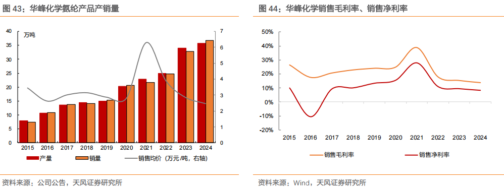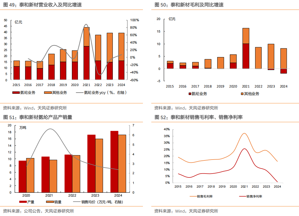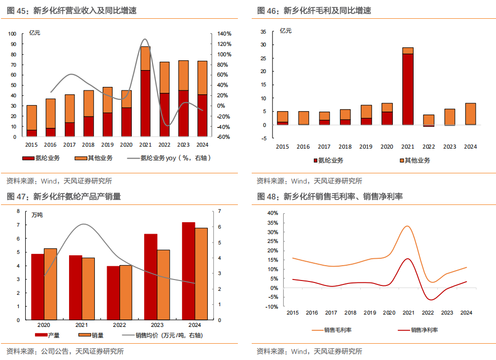 截至2024年,公司具备32.5万吨氨纶产能(国内市占率24%),同时在建的15万吨稳步推进,逐步投产,公司预计2026年底前全部完成达产。2024年,公司实现营业收入269亿元,其中氨纶业务收入91亿元,占比34%;实现毛利37亿元,氨纶业务毛利12亿元,占比33%,毛利率为14%。