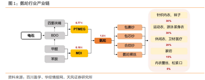 氨纶的生产成本主要包括原材料、制造费用、人工和运费。氨纶的主要原材料是PTMEG(聚四氢呋喃)和纯MDI(聚氨酯),PTMEG 的主要原材料为 BDO(1,4丁二醇),其中原材料成本在氨纶总成本中占比约42%。与其他化学纤维(粘胶、涤纶等)相比,氨纶的原材料成本占比较低,非原料成本的控制是生产企业成本壁垒的主要来源。