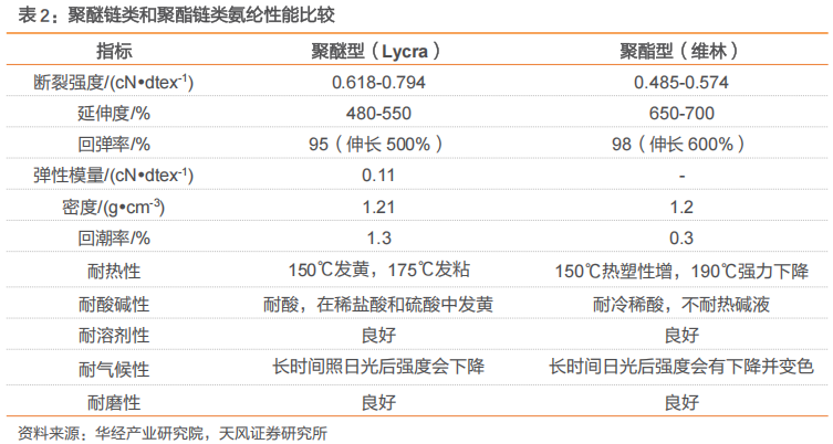 注*:是指与其他高聚物嵌段共聚时至少含有85%的氨基甲酸酯的链节单元组成的线性大分子所构成的长丝,氨纶纤维优良的高弹性和高回弹性主要来源于聚氨酯结构所赋予的特性。根据分子结构不同,氨纶可分为聚醚链类和聚酯链类,其中聚醚类弹性纤维防霉性,抗洗涤剂较好;聚酯类弹性纤维抗氧化、抗油性较强。