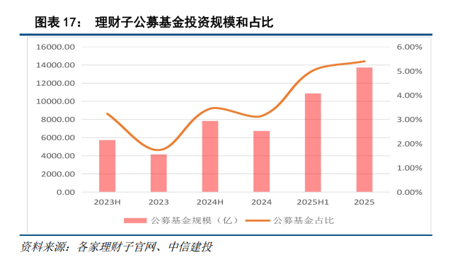 展望2026年,资产配置惯性和理财子转型主导理财子的资产配置结构。其一、资产配置的惯性。(1)现金及银行存款占比预计会降低。目前,各家理财子现金和银行存款的占比在回升而且达到近5年以来的最高值。预计全年的占比可能会有所降低。(2)公募基金占比预计会提高2%左右,增量在8000亿左右。公募基金已经转变为理财子“增厚收益的重要工具”, 也是间接参与权益市场分享权益市场红利主要方式,预计2026年占比提高2%左右,增量大致在8000亿。(3)权益类资产占比预计会提高,预计提高0.5%,增量2000亿左右。其二、理财子转型。固收 成为主方向、理财子需要寻找其他增厚收益的资产类型、适当提高产品收益率、在分类监管的框架下理财子需增强投研能力,所有这些都将激励理财子提高权益类投资的占比。总而言之,理财子直接或者间接参与权益市场的资产占比会提高,无论是公募基金还是权益类资产、衍生品、境外资产占比等。
