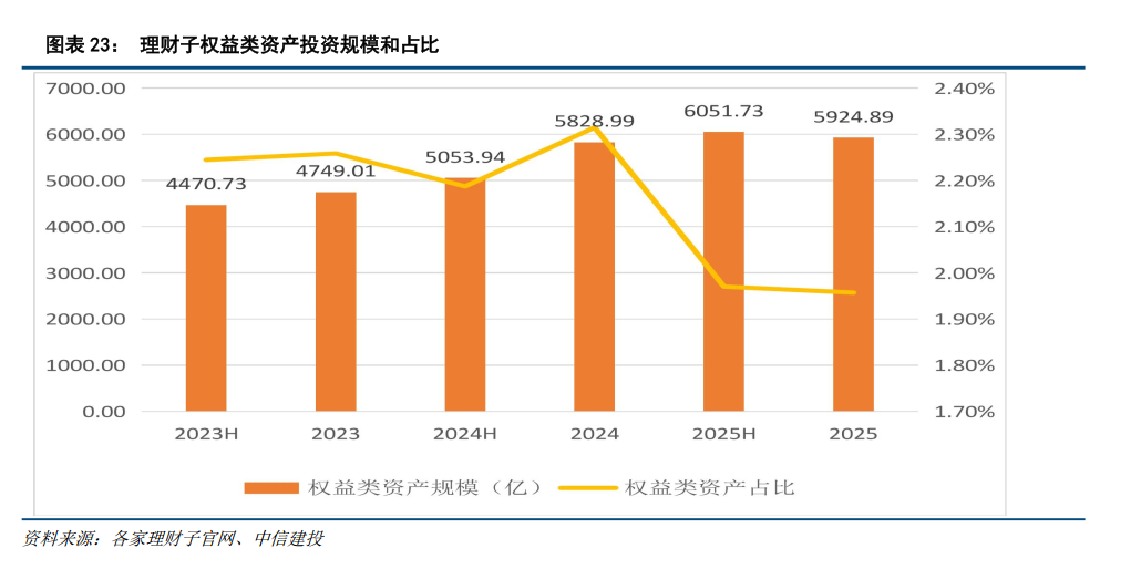 2025年,银行理财子产品结构的变化:混合类产品规模和占比提高,权益类规模和占比下降。2025年,理财子的混合类/权益类产品余额占比分别为:2.01%/0.09%,规模分别为:8274亿/249亿,整体占比较低,但是混合类产品余额和占比较2024年回升,权益在降低。理财子中混合类产品占比高于行业均值的只有5家,分别为:光大理财、农银理财、中邮理财、招银理财、工银理财。理财子中权益类产品占比高于行业均值的只有3家,分别为:渤银理财、民生理财和兴银理财。