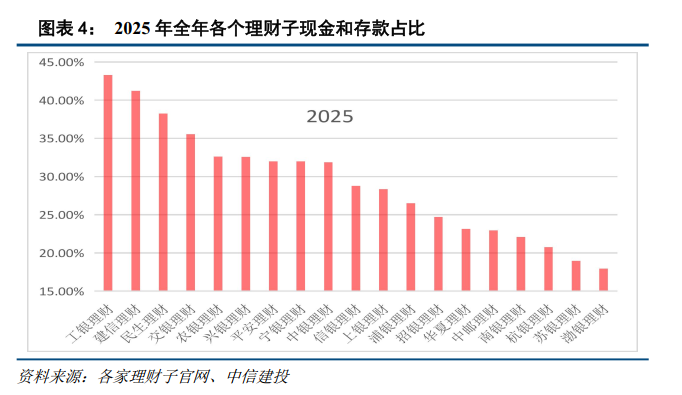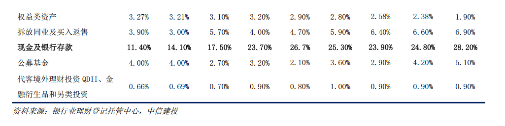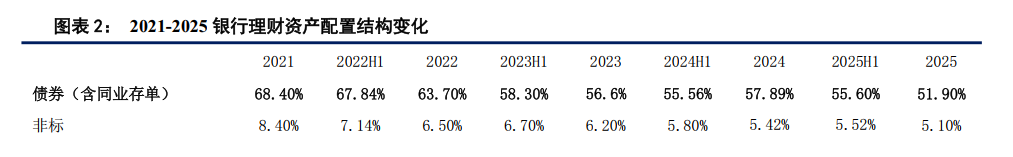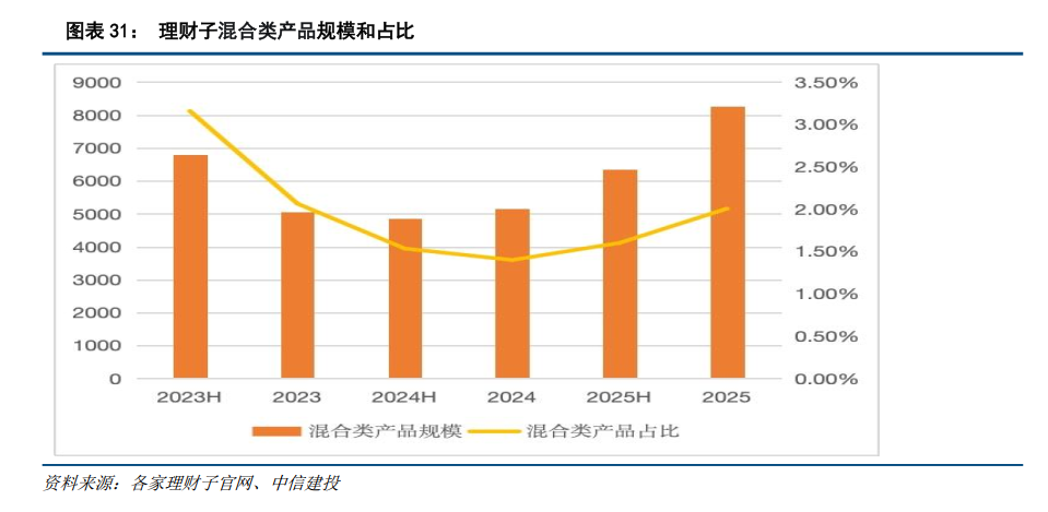 面对估值整改和上市银行优先股提前赎回,2025年理财子资产配置降低风险偏好,大幅提高现金及银行存款配置占比,同时在利率下行期,理财子大幅提高公募基金的配置占比,降低债券、同业存单、权益类资产配置占比。2025年,理财子混合类产品平均占比为2.01%,规模8274亿,规模和占比继续回升,混合类产品的拐点进一步确认。展望2026年,全面净值化后,资产配置惯性和理财子转型主导资产配置,产品结构和资产结构将齐头并进,产品端:混合类和权益类产品占比将提高,资产端:同权益相关的资产占比预计回升,现金及存款、非标、债券、同业存单占比将降低。