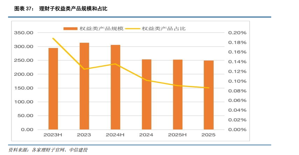 2025年,银行理财产品结构的变化。2025年,理财产品中固收类/混合类/权益类占比为 97.09%/2.61%/0.24%,2025年全年,混合类占比提高0.17%,规模提高0.14万亿,而权益类产品中占比提高0.04%,规模提高0.02万亿。混合类产品拐点在2025年上半年出现,2025年下半年,混合类产品规模和占比继续回升,混合类产品拐点进一步确认。
