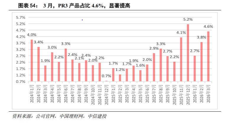 展望2026年,理财子混合类产品和权益类产品的规模和占比将稳步提高。主要原因是:其一、理财子年初以来加快了权益类产品和混合类产品的发行,带动规模和占比提高。本年年初以来,招银理财发行一只权益类产品;截至2025年3月底光大理财、农银理财总计发行了20只混合类产品。其二、居民风险偏好在提高,理财子增加PR3等高风险等级产品来适应客户需求的变动,混合类和权益类产品数量增加;2026年前3个月,样本理财子PR3产品数量占比在持续回升。其三、理财子需要积极参与权益市场,无论是参与定增、打新、战投等都需要有对应的混合类和权益类产品,政策也在积极引导中长期资金入市,同时发行混合类和权益类产品也有助于加快理财子投资策略向多资产多策略转型。
