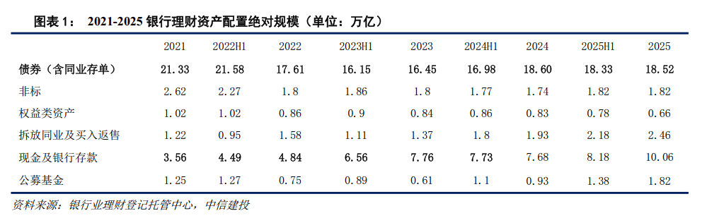 2025年,银行理财的资产配置结构的变化。2025年,理财资金增持了现金及银行存款、公募基金、拆放同业及买入返售,其中:现金及银行存款增加最多,其次是公募基金;但是减持了非标资产、债券和权益类资产。从而可见,2025年理财资产配置大幅提高流动性资产,增厚收益资产在逐步从权益类资产转向公募基金。