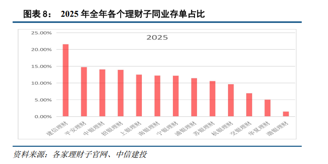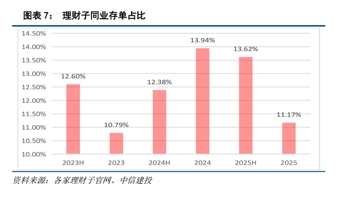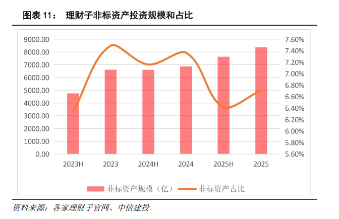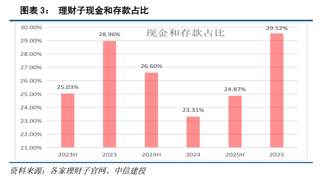 2025年,理财子的资产配置结构的变化。2025年,理财子的资产配置结构中,占比提高的资产类型包括:现金及银行存款、公募基金,其中:现金及银行存款规模和占比增幅大,同时公募基金的规模和占比提高也显著。占比降低的资产类型包括:同业存单、债券、非标资产、权益类资产。