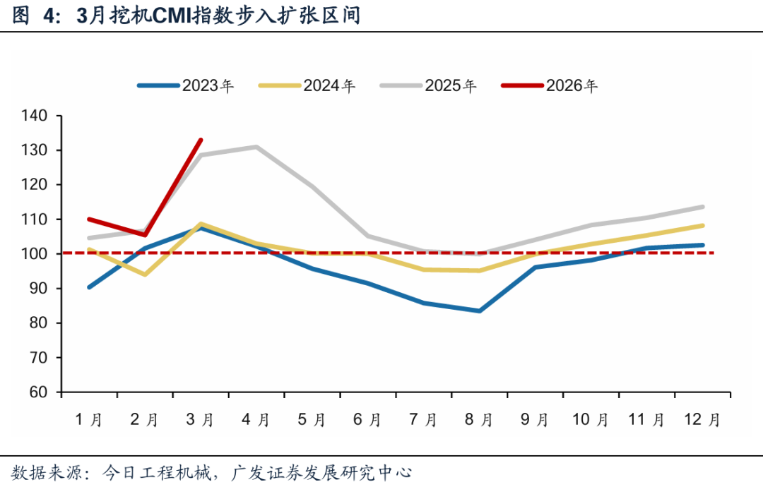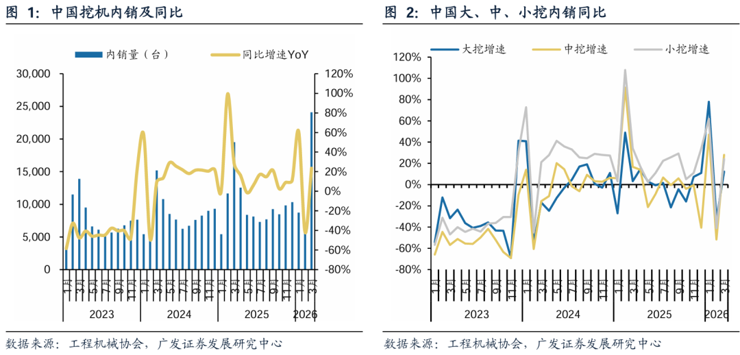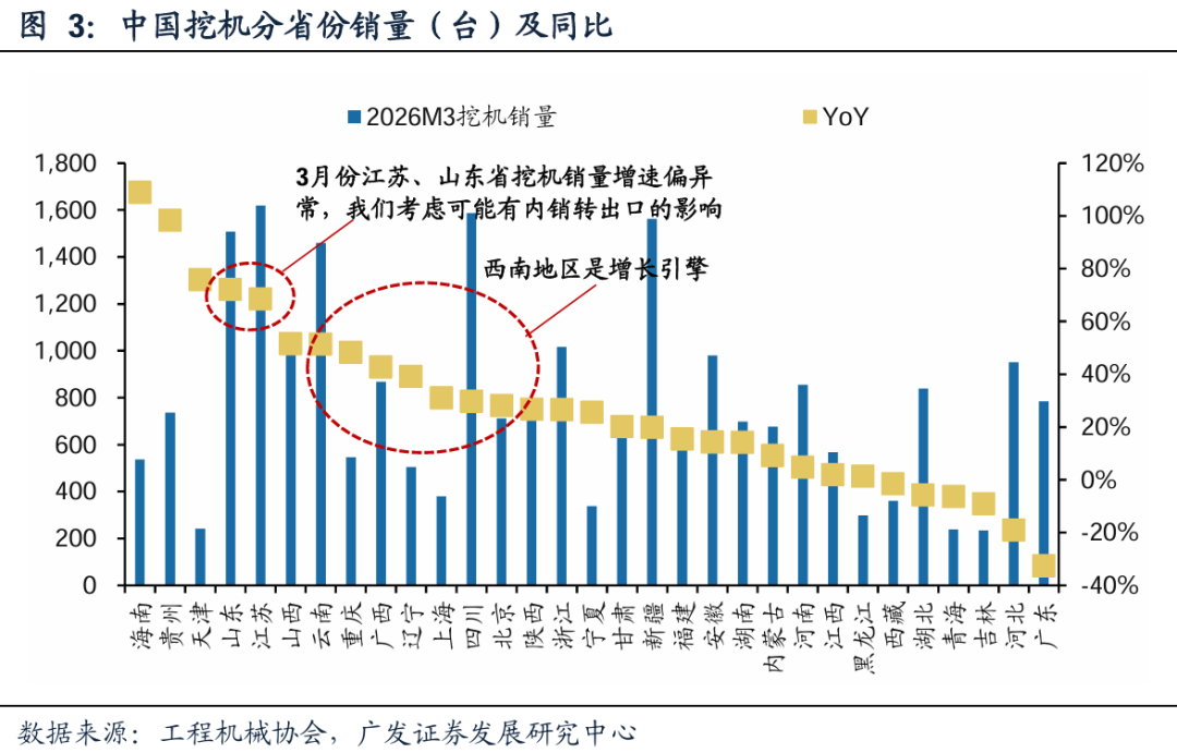 根据工程机械协会数据,26年3月挖机内销24106台,同比 23.5%,结构性看,中小挖增速较快,各省份分化依然严重:(1)西南地区仍为增长中枢,包括云南、四川、广西等地,大型工程包括地铁项目、平陆运河、雅下工程等;(2)内销转出口现象仍存在,以江苏、山东为例,3月挖机销量同比 72%、 69%,我们认为该地区增速超过其本地化需求,二者均为沿海港口城市,可能存在内销挖机转售出口的现象,若剔除两地影响,3月挖机内销同比 15-20%,可作为未来前瞻性参考。