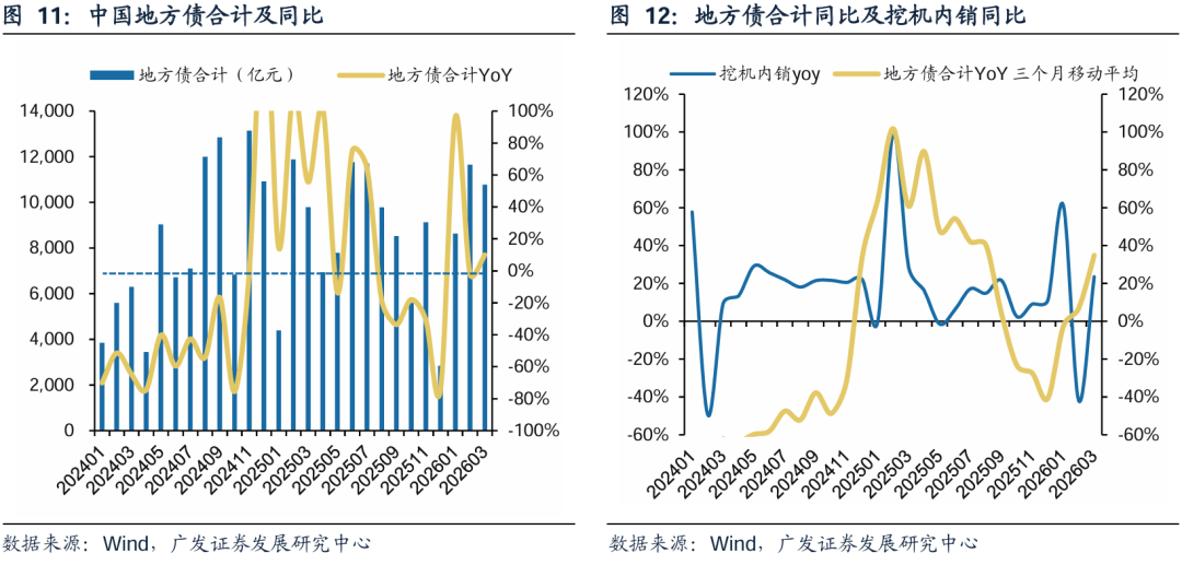 工程机械行业下游的资金驱动因素正逐步由过去的民间投资(企业中长期信贷投资)向广义财政(政府债券投资)转变。根据我们复盘,25年以后,地方政府债的发债额同比与挖机内销同比表现出较高的一致性,因为地方债是挖机内销的前瞻指标,挖机内销择时宏观经济的晴雨表。