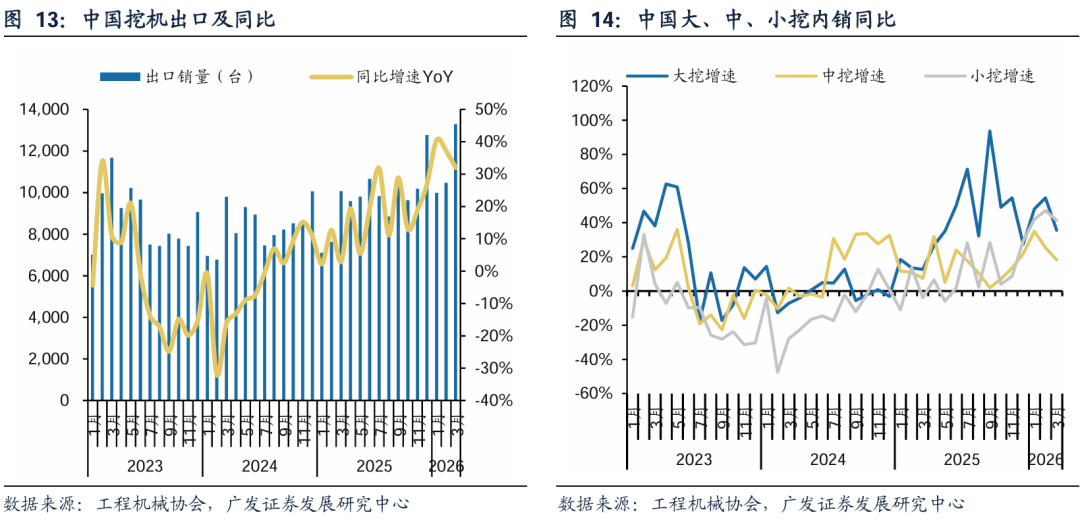 根据工程机械协会数据,26年3月挖机出口销量13296台,同比 32%,大挖依然保持高速增长(亚非拉采矿需求带动),小挖增速加快(欧美复苏需求带动)。