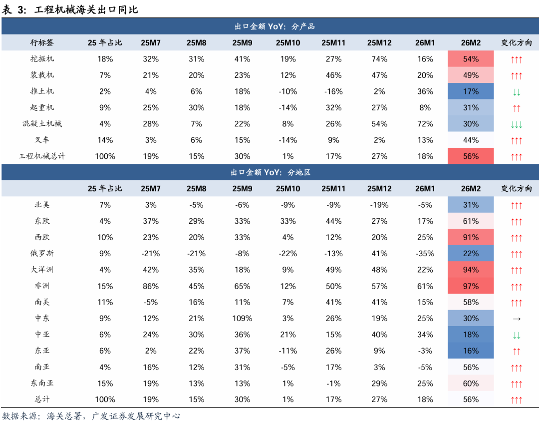 根据海关总署看,26年1月、2月工程机械总出口金额明显上台阶,同比 18%、 56%。分产品看,26年2月挖掘机、装载机、叉车出口较好;分区域看,26年2月非洲、大洋洲、西欧同比增速均在90%以上。