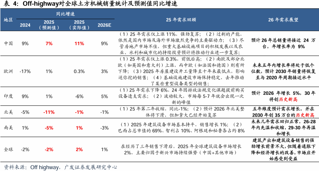 根据Off-highway数据,25年全球土方机械销量同比 2%,好于25年初的预测值(同比-2%),其中中国、北美、南美等地区均好于原有预期。按照26年预测的景气度排序,分区域看。