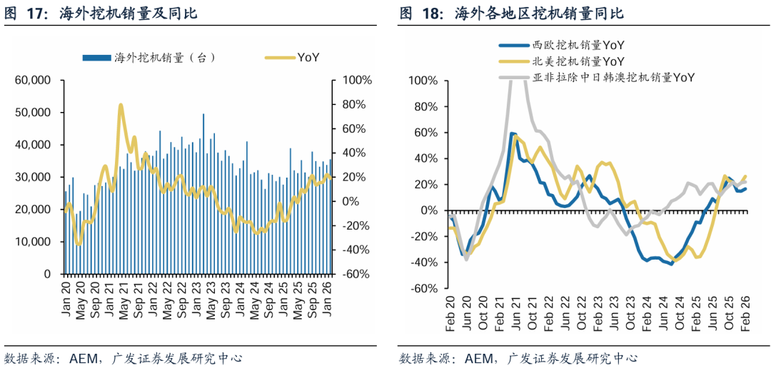 根据AEM数据,全球工程机械基本为4-5年一个周期,26年1-2月海外挖掘机总销量增速创22年周期以来的新高,全球各地区周期向上。分区域看,亚非拉在24年率先复苏,欧美地区在25年复苏,其中北美地区的复苏斜率最为陡峭。