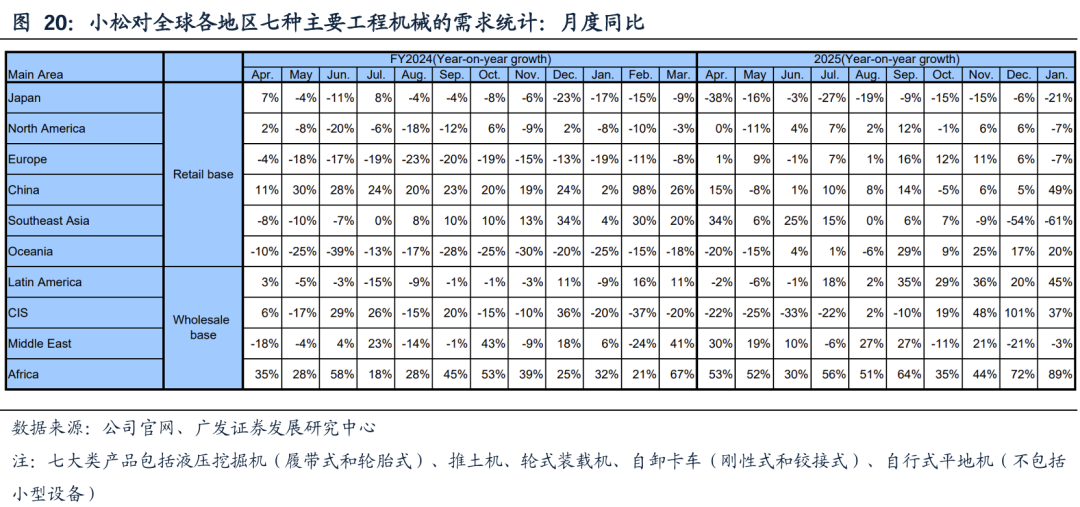 从月度的高频数据看,以26年1月为例,全球各地区七种主要工程机械的同比增速排序为:非洲 89%>中国 49%>拉美 45%>独联体 37%>大洋洲 20%>中东-3%>欧洲-7%>北美-7%>日本-21%>东南亚-61%。