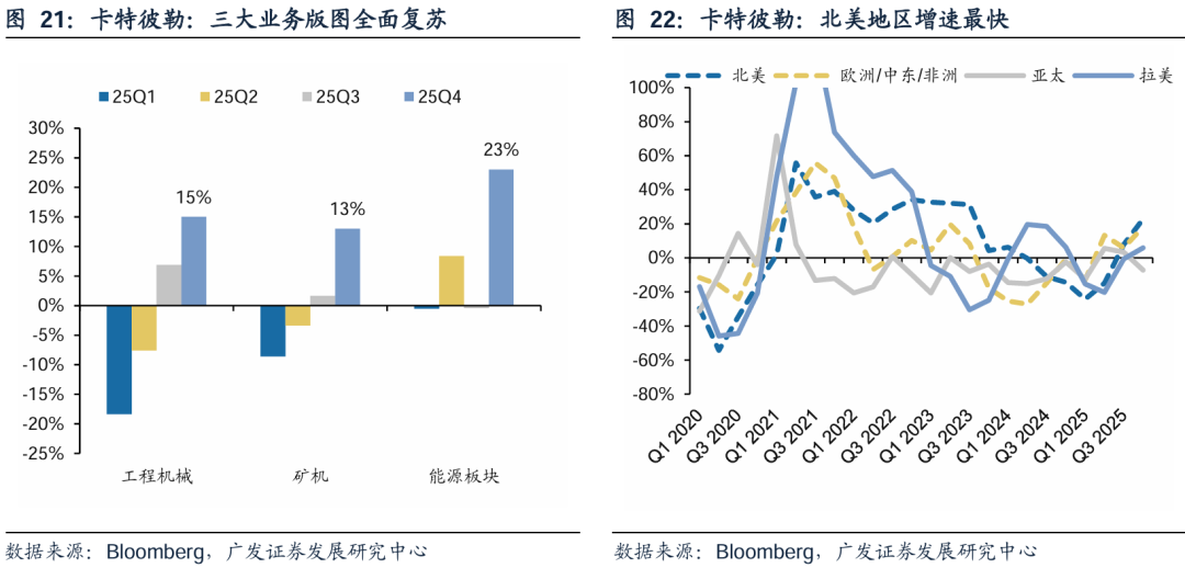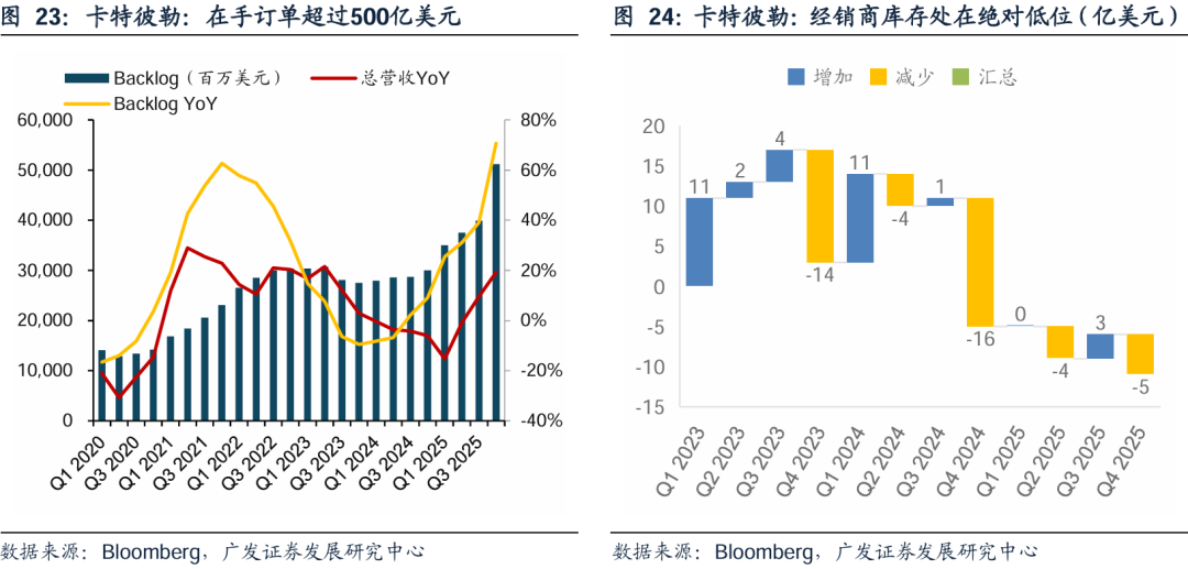 根据Bloomberg,25Q4卡特工程机械业务美国同比 23%、欧洲北非同比 16%,拉美 6%,亚太-7%,;25Q4卡特矿机业务同比 13%,其中北美、欧洲北非增速达到30%以上,反映了全球矿业资本开支增加。截止25年底,卡特彼勒经销商库存相较于23年初低10亿美元以上;同时,卡特彼勒积压了500亿美元以上的在手订单,25Q4在手订单增速同比 71%。