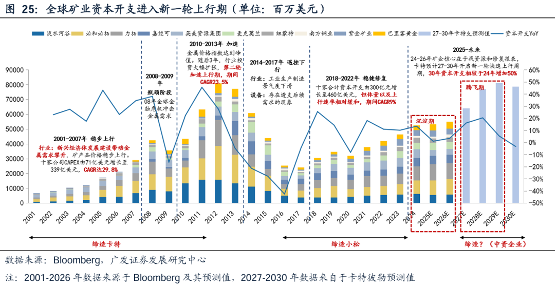 全球矿业资本开支正步入新一轮上行周期起点,历史周期规律与设备自然更新需求共振,为矿山装备产业链带来结构性成长机遇。行业资本开支呈现显著周期性,上一轮完整周期已历经2001-2007年稳步上行、2008-2013年加速扩张及2014年后递减调整的全过程。当前行业在经历2018-2022年的稳健修复后,进入新一轮向上阶段。据头部设备商预测,2027-2030年期间全球矿业资本开支将进入快速上行通道,至2030年资本支出规模预计较2024年增长约50%。从历史经验看,每一轮行业上行期均推动产业格局重塑,这为中资矿山装备企业参与全球竞争、提升市场份额提供了重要战略窗口。