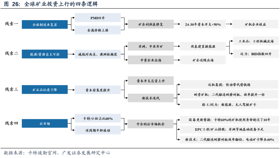 基于全球矿业资本开支进入新一轮上行,叠加全球制造业复苏、金属价格上涨带来的矿企利润修复,以及中资企业加速出海、技术迭代与存量设备更新换代等多重因素共振,围绕矿山行业正形成以下四条清晰的核心逻辑:全球制造业复苏、能源和资源的自主可控、矿石品位度下降以及企业资产负债表修复、后市场拓展。