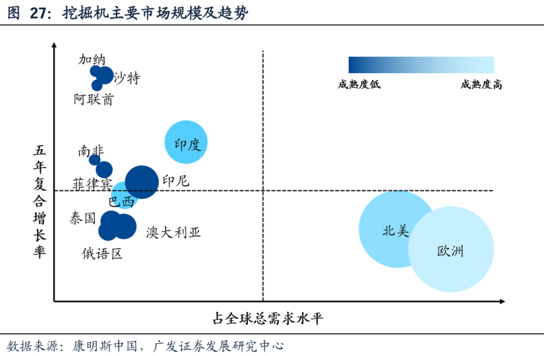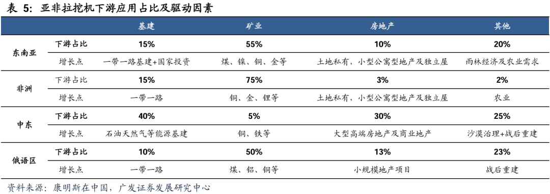 亚非拉是海外增长较快的市场。从全球挖掘机需求占比、复合增速两个维度拆分看,北美、欧洲是成熟度最高的市场,亚非拉是虽然占比较小但是增速快,其中主要的四个增长极为东南亚、非洲、俄语区和中东。若进一步对下游需求来源进行拆分,矿业和能源是最重要的两个下游。