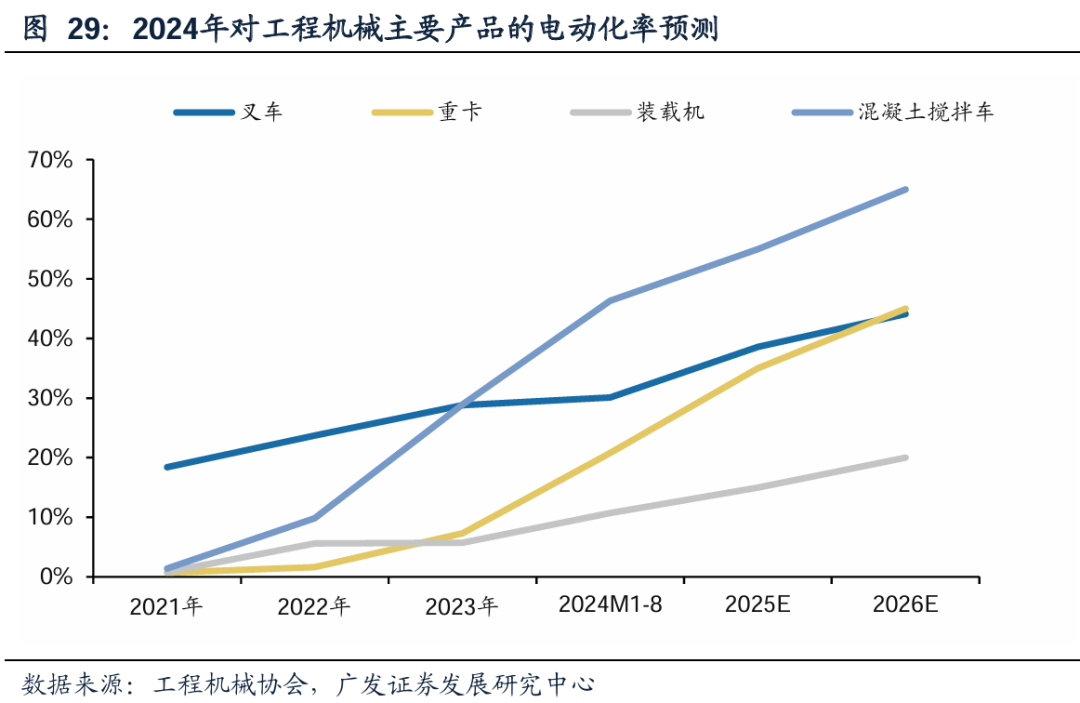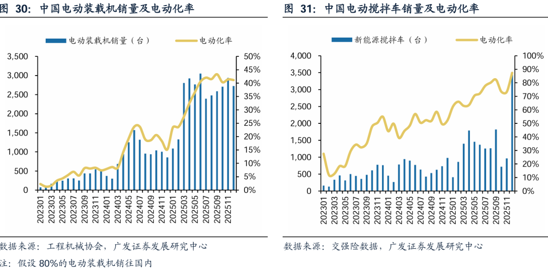 (2) 装载机、混凝土搅拌车:带电量大,且场景相对固定,主要进行点对点的作业,该类产品25年电动化渗透全面超预期,24年中旬预计25年搅拌车、装载机的电动化率分别为15%、55%,而25年电动化率的实际值约40%、80%,该类产品的突破基本意味着工程机械三电技术的基本成熟,接下来又能向智能化、无人化进一步迭代发展;