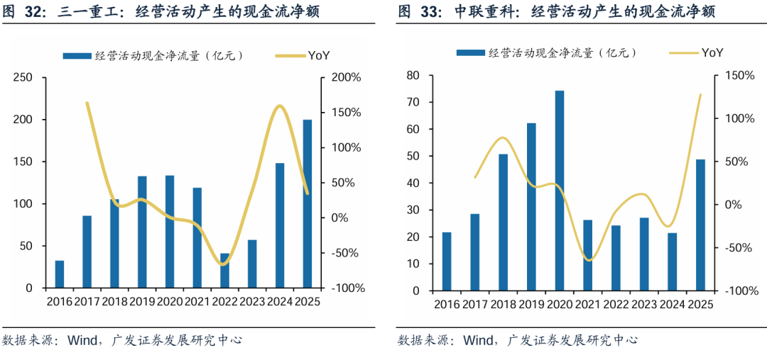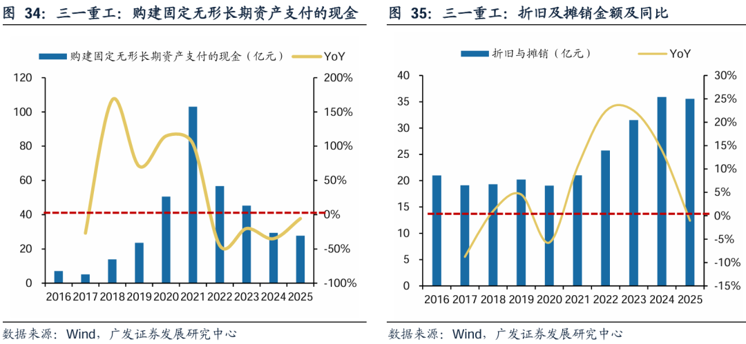 (1) 企业经营质量的提升内涵于“现金流量表”,如三一重工2025年经营性现金流净额达到200亿元,相较于上轮周期峰值(2020年)增加49%;除此之外,三一重工的资本开支已经步入下降通道,折旧摊销的顶点已过,因此未来利润和现金流兑现上会更加通畅。