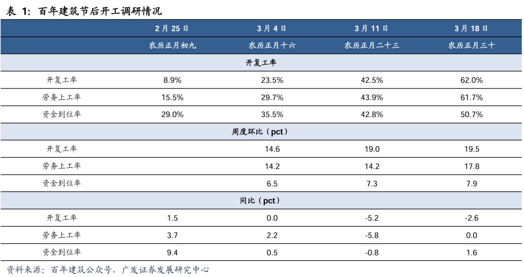 根据百年建筑公众号对春节后样本工地开工情况的统计看:(1)正月期间,开复工率、劳务上工率、资金到位率保持环比复苏趋势;(2)与去年同期比较看,节后第四周(农历正月三十)的资金到位率表现优于去年同期,劳务上工率基本持平,开复工率略低。